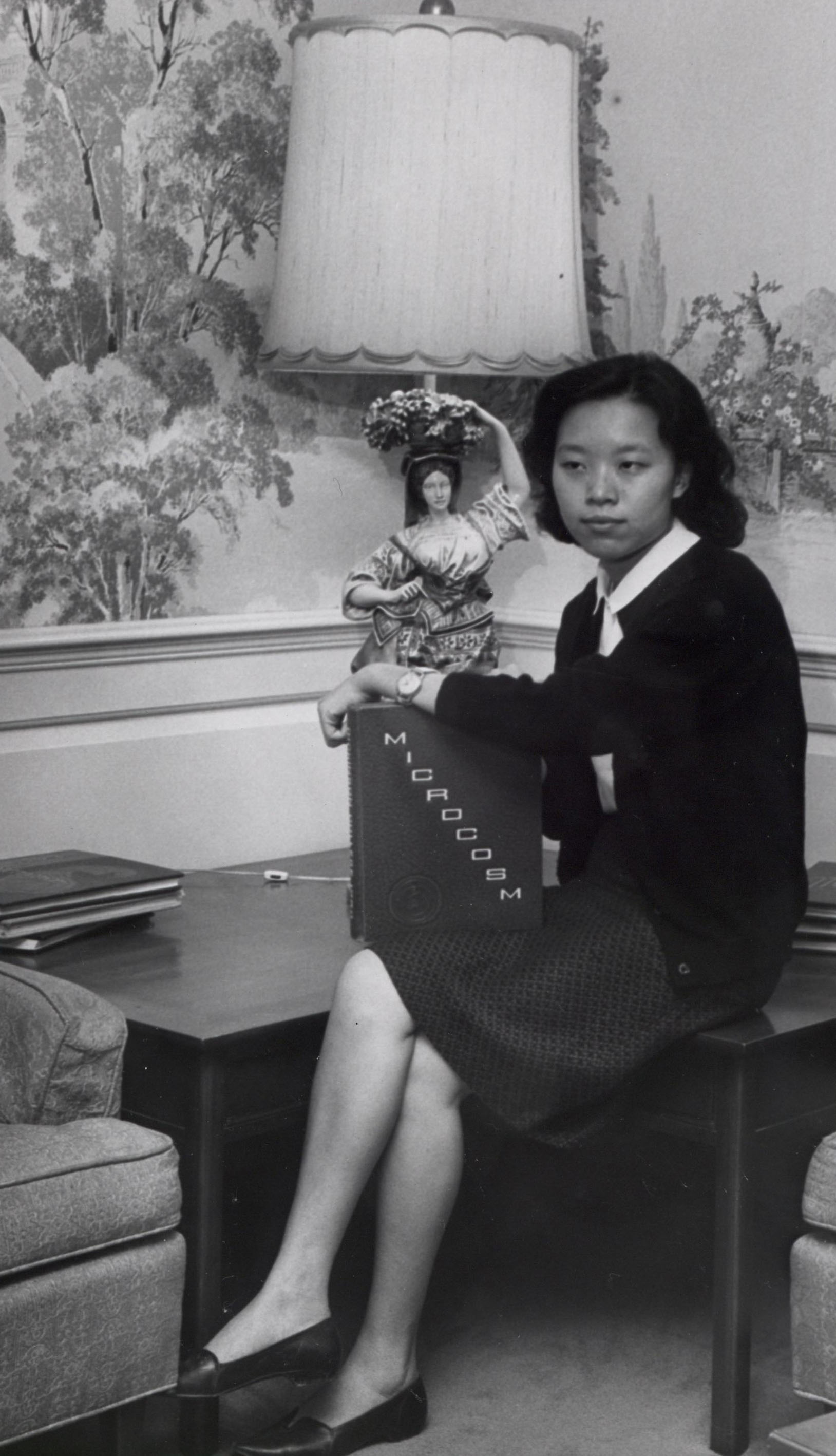 Sachito Fujimoto, an international student, poses with a copy of the 1959-1960 Microcosm.