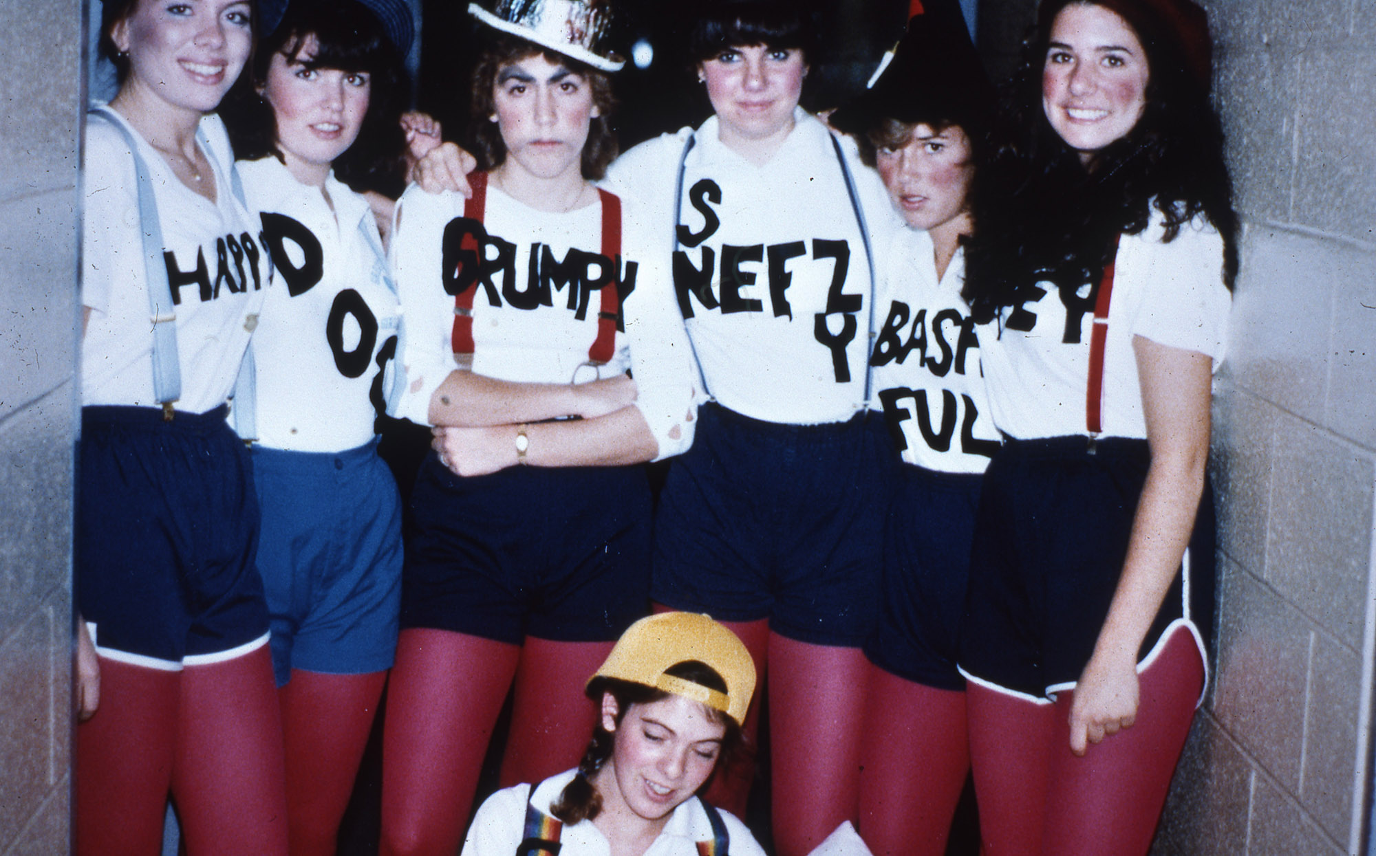 A group of seven female students show off Snow White and Seven Dwarfs costumes.