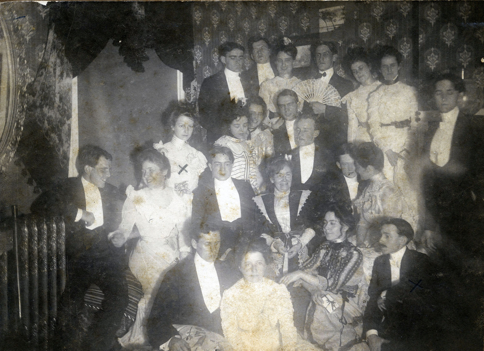 Members of Sigma Alpha Epsilon at a party with their dates around 1900.