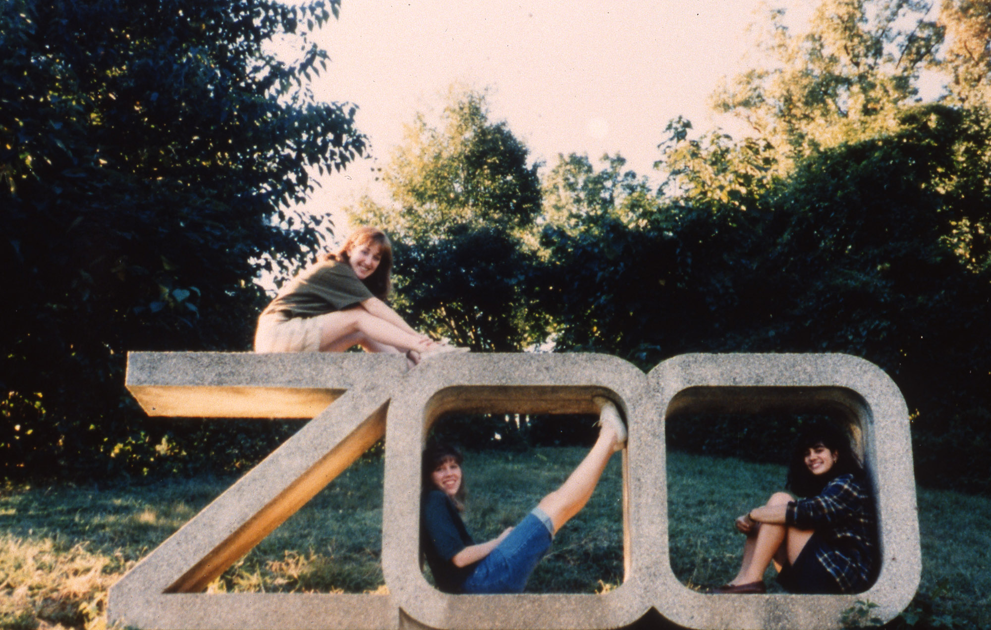 Three students pose on a sign for the Smithsonian's National Zoo in Washington, DC.