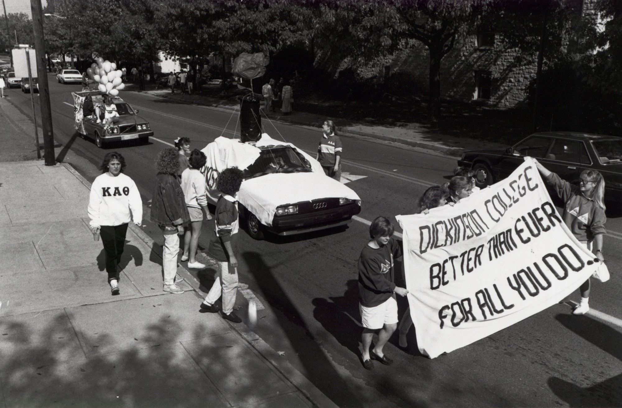 View as sorority floats drive through campus during Homecoming weekend in October 1987. The girls of the Delta Delta Delta sorority hold up a sign that reads: "Dickinson College, better than ever for all you do…"
