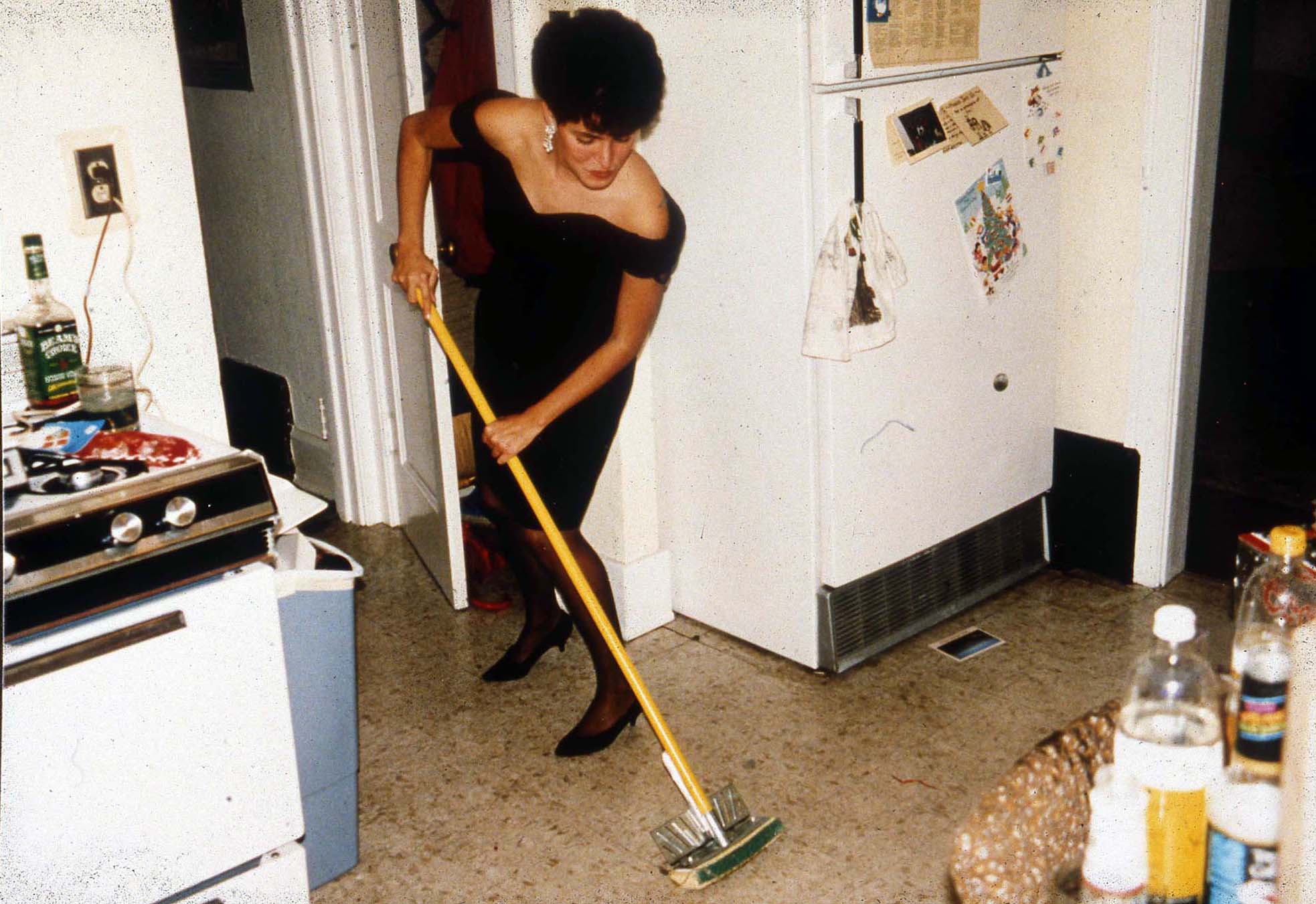 A student mops up the floor of a kitchen while wearing a formal black dress and heels.