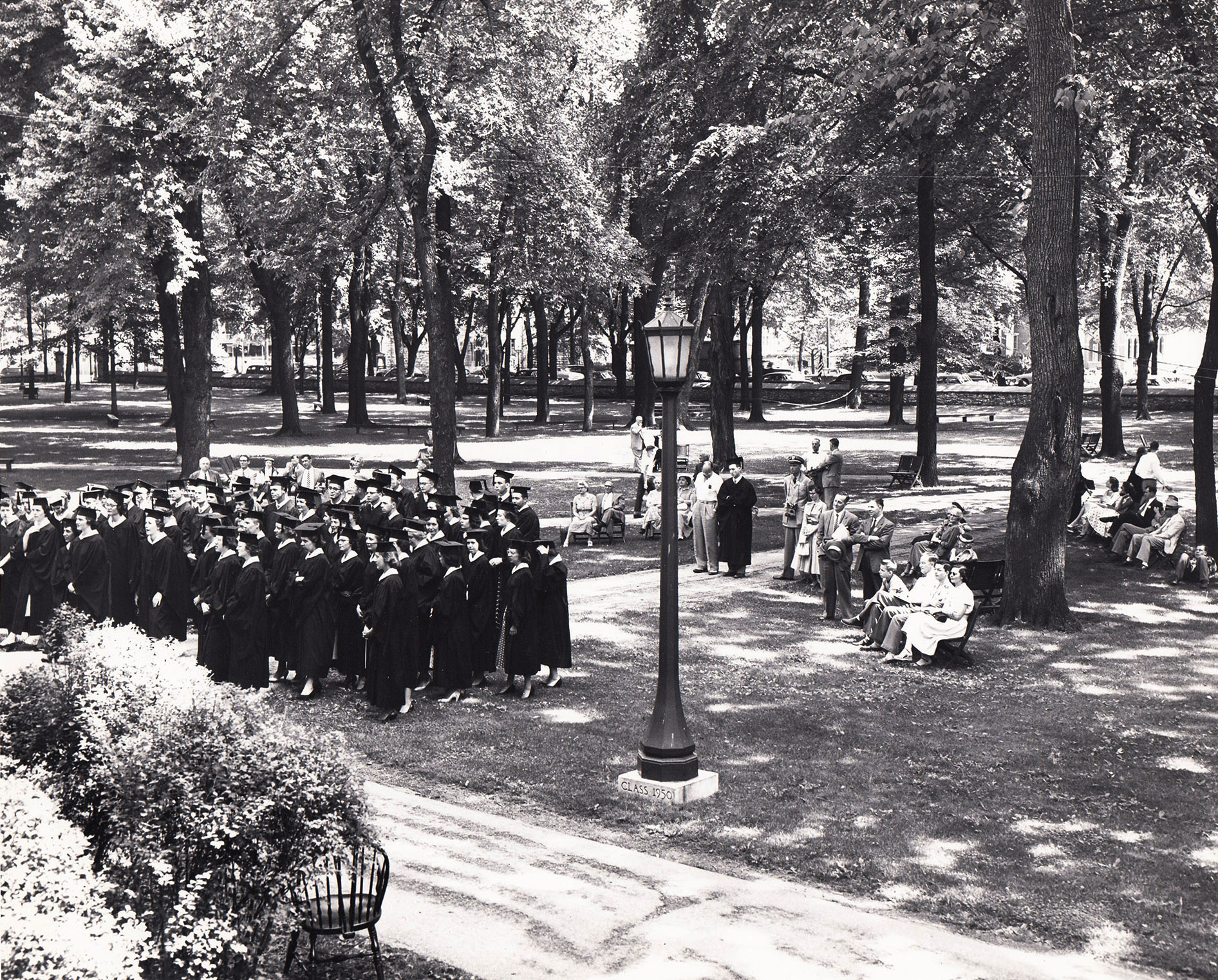 A group of students stand on the Academic Quad in front of Old West at Commencement on June 13, 1954.