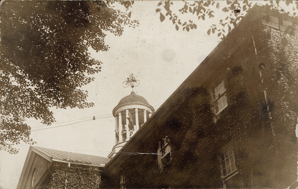 Photograph of students on the Old West cupola when a bicycle was attached to the mermaid. The bike was put there as a prank by freshman members of Alpha Chi Rho during the 1914-15 school year. According to a letter by Frank Masland, class of 1918 and one of the participants, the stolen bike belonged to Chaplain Springer. The operation took place in the middle of the night, and the four students made a human ladder by climbing on each others shoulders in order to reach the top of the cupola and hoist the bike up. The college had to hire steeple jacks to take the bike down, after which the boys promptly stole it again.