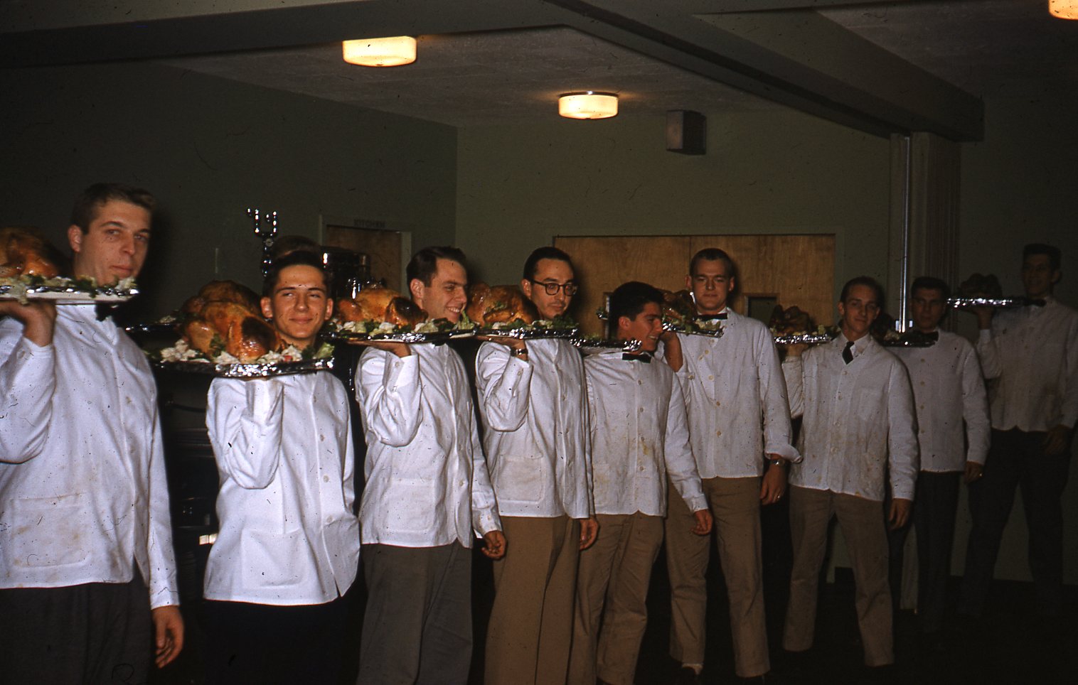Servers (students) carry turkeys for Thanksgiving Dinner in Drayer Hall around 1960.