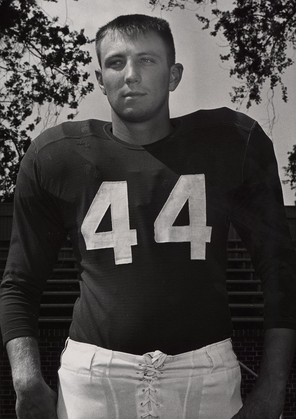 Thomas Loughery Moore Jr., a member of the Class of 1959, in his football uniform. Location Photograph Archives Format Photographic Print, B&W Decade 1950-1959 Roles Students People Moore, Thomas Loughery (Jr.)