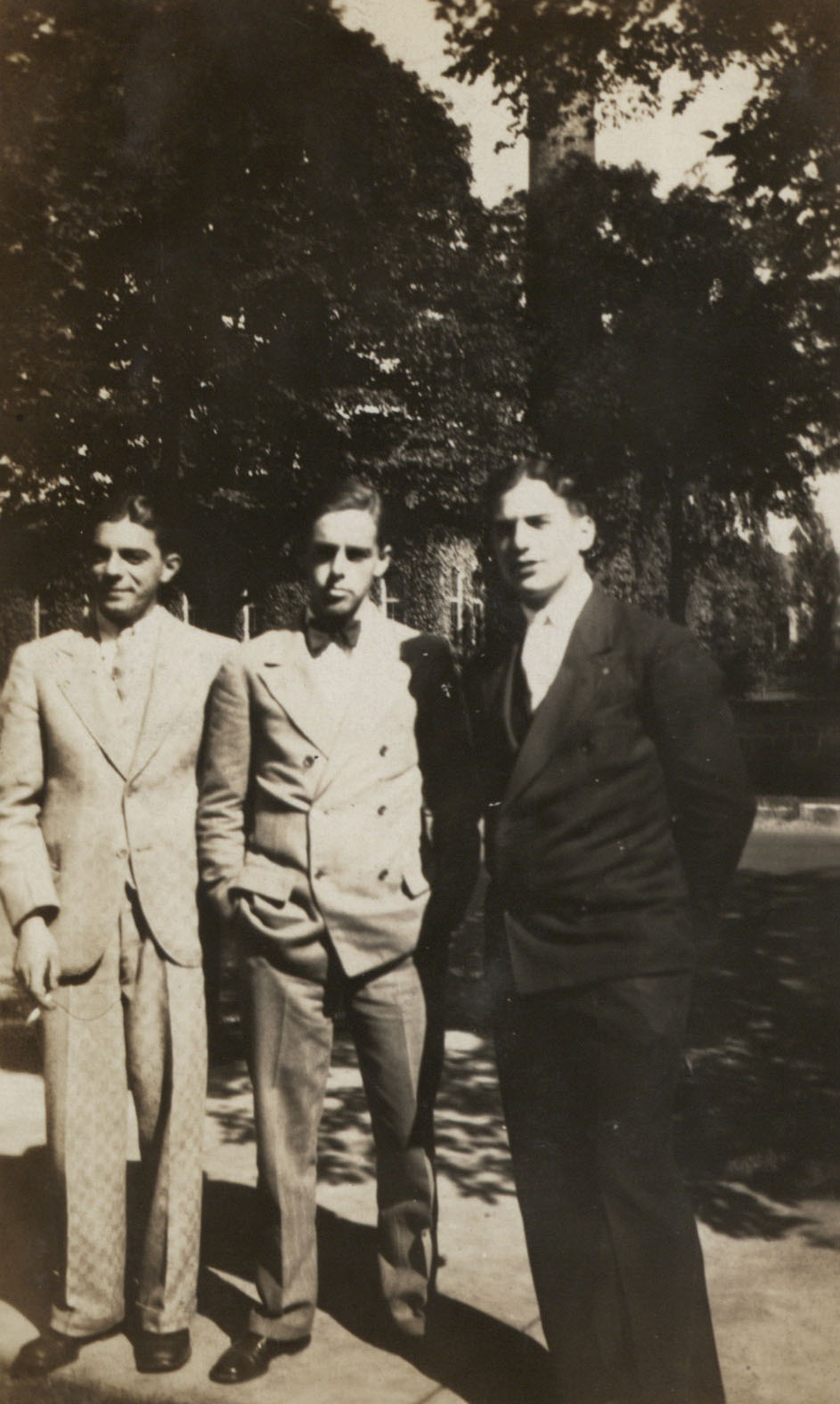 Three students - Dan Cavalier '30, Osmer Dixon "Dick" Marshall '28, and Bill Johns '30 - stand together on Sunday September 25, 1927. The caption reads "3 Musketeers."