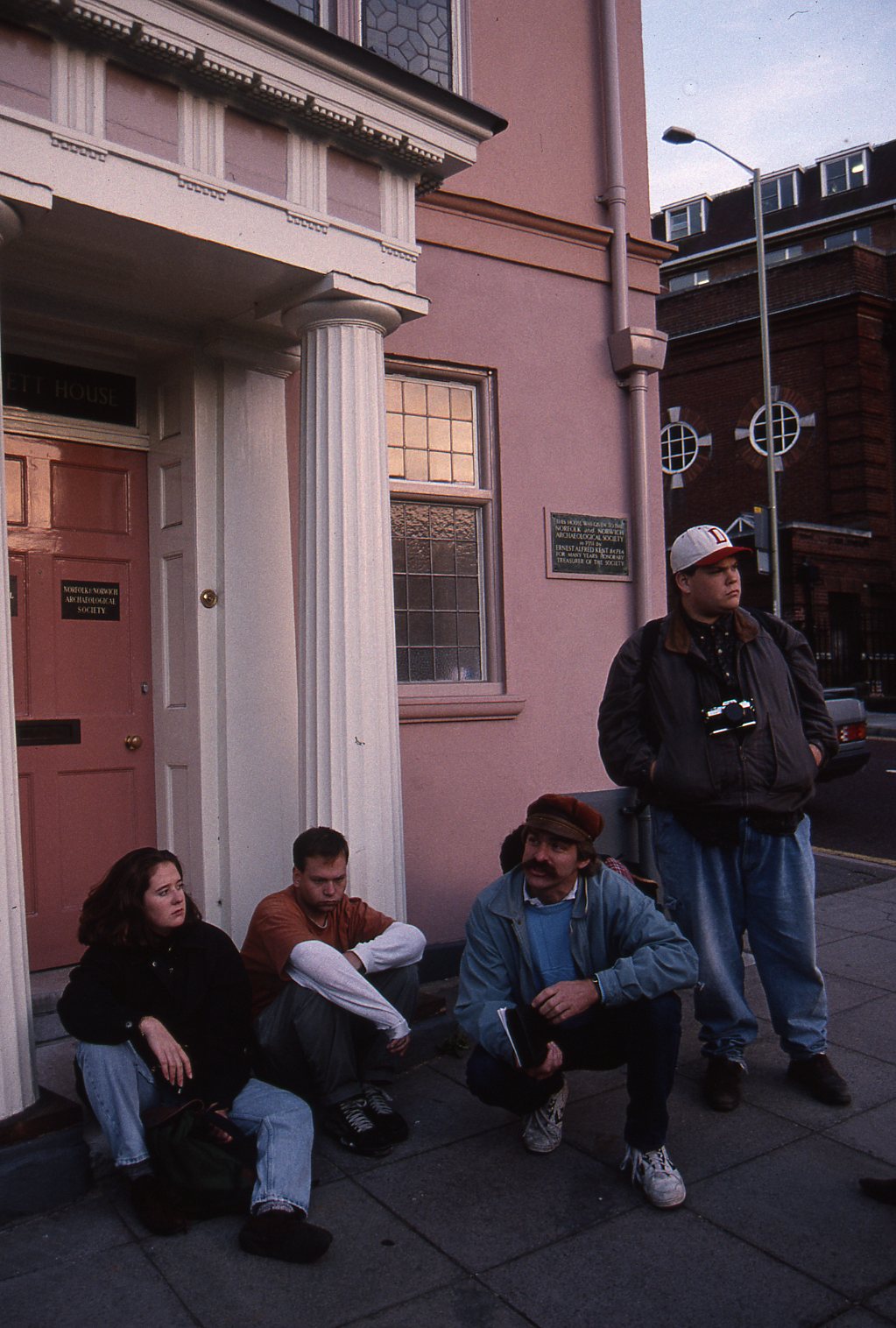 Three students and Professor Todd Wronski, second from right, in Norwich during a walking tour in October 1995.