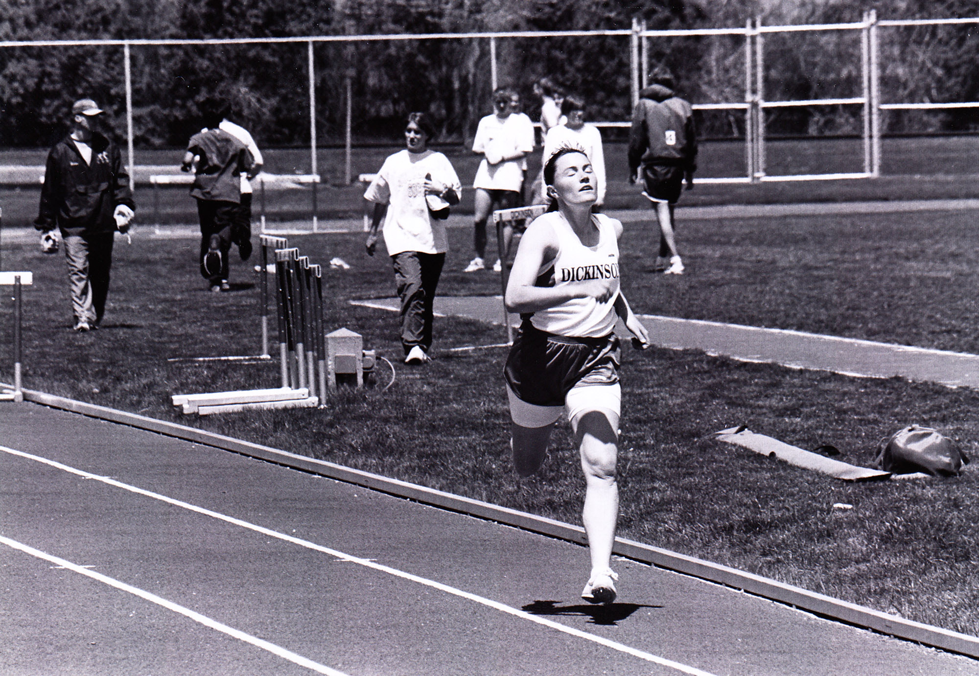 A Dickinson runner competes in a track meet in 1995. Location Photograph Archives Format Photographic Print, B&W Decade 1990-1999 Athletics Track and Field (Women's) Roles Students