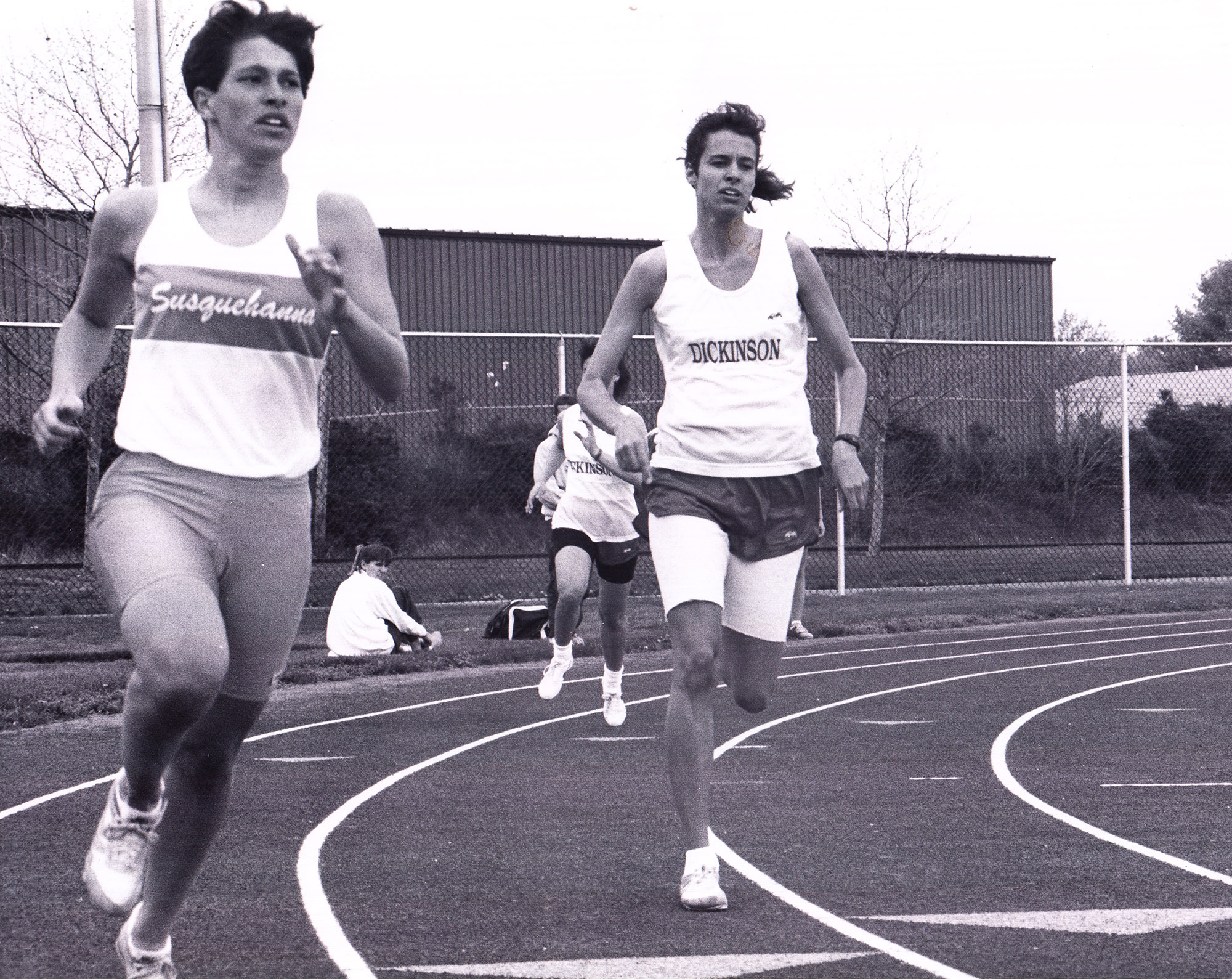 Runners compete at a track meet on Biddle field in 1983. Location Photograph Archives Format Photographic Print, B&W Decade 1980-1989 Athletics Track and Field (Women's) Roles Students