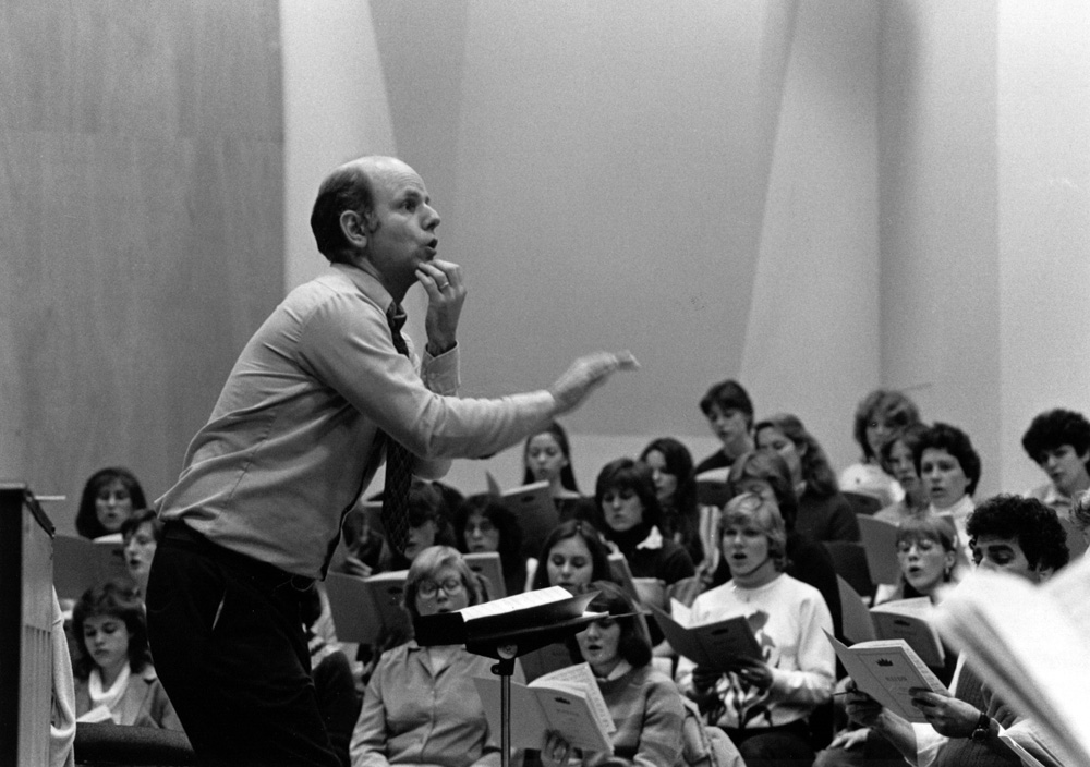View of Music Professor Truman Bullard directing a choir practice in 1983.