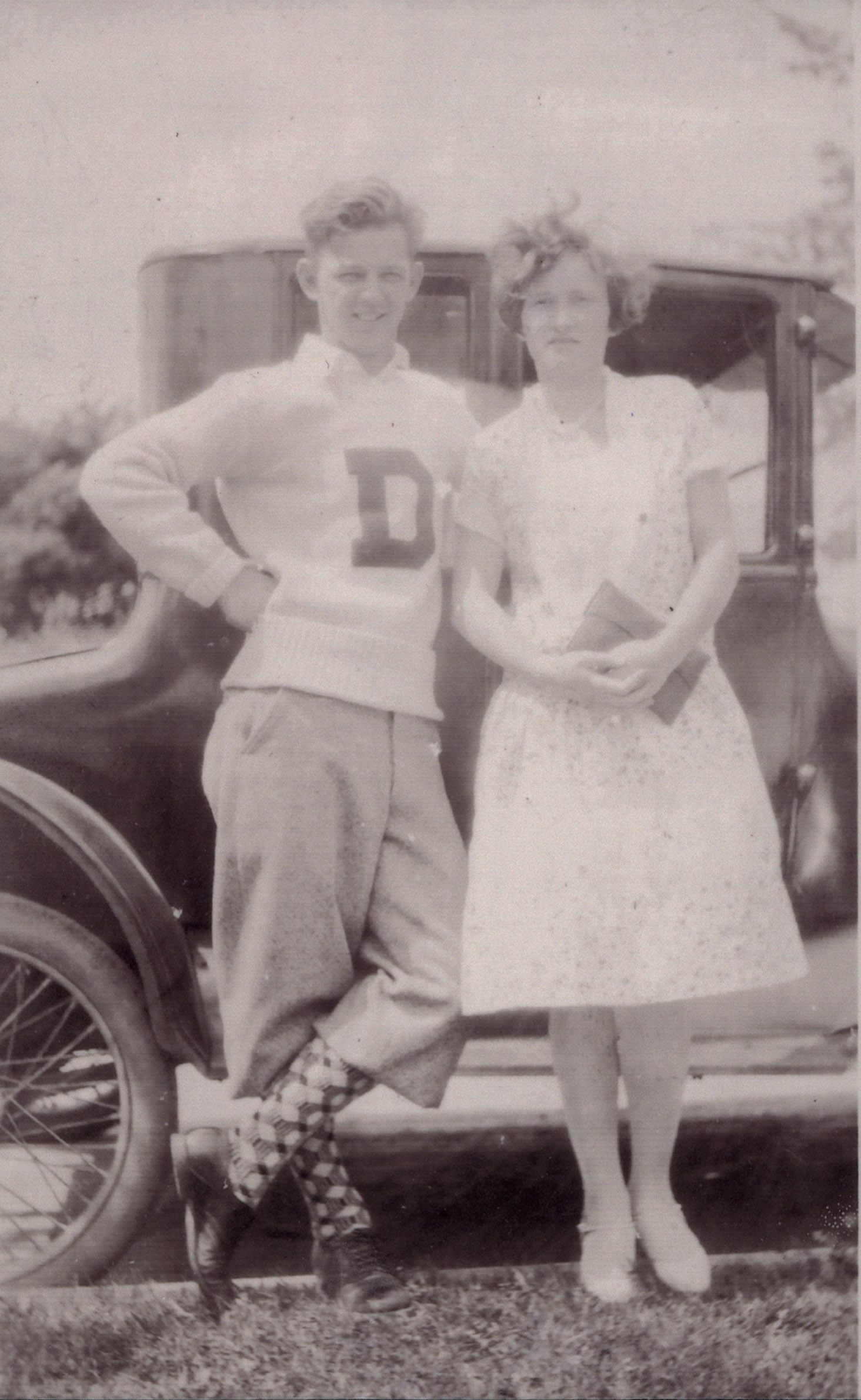 Two Dickinsonians stand in front of a car around 1930.