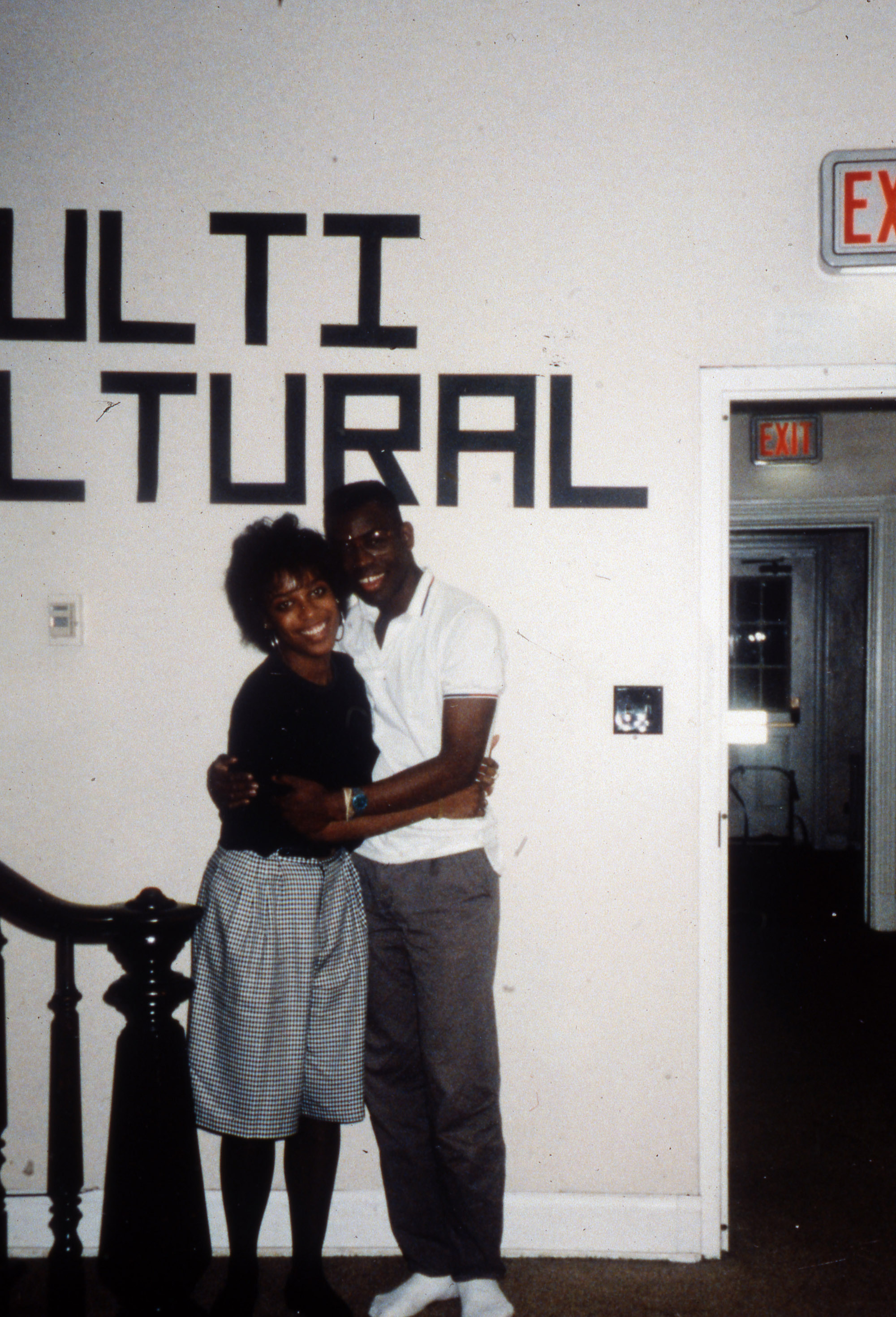 Two students embrace. A "multi-cultural" sign is visible in the background.