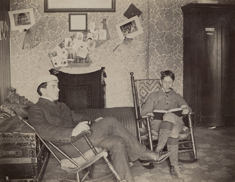 View as two students sit in rocking chairs, possibly in their dorm room, around 1900.