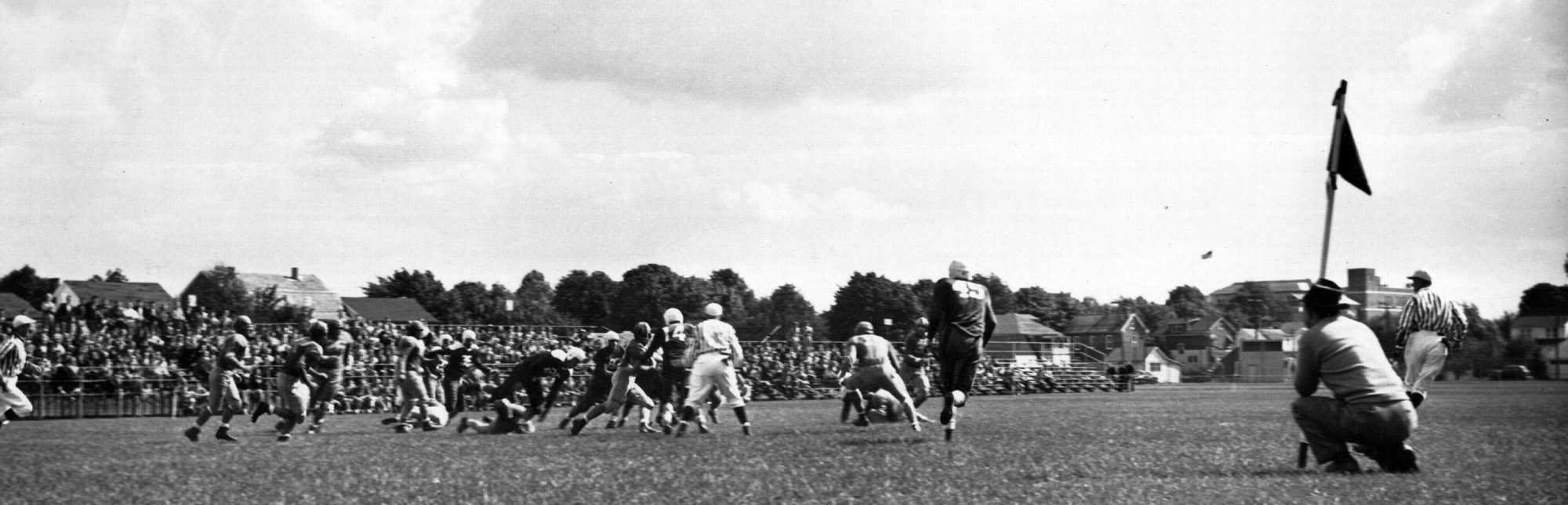 A live-action shot from a Dickinson football game, taken from the field's sideline. Location Photograph Archives Format Photographic Print, B&W Decade 1940-1949 Athletics Football Roles Students