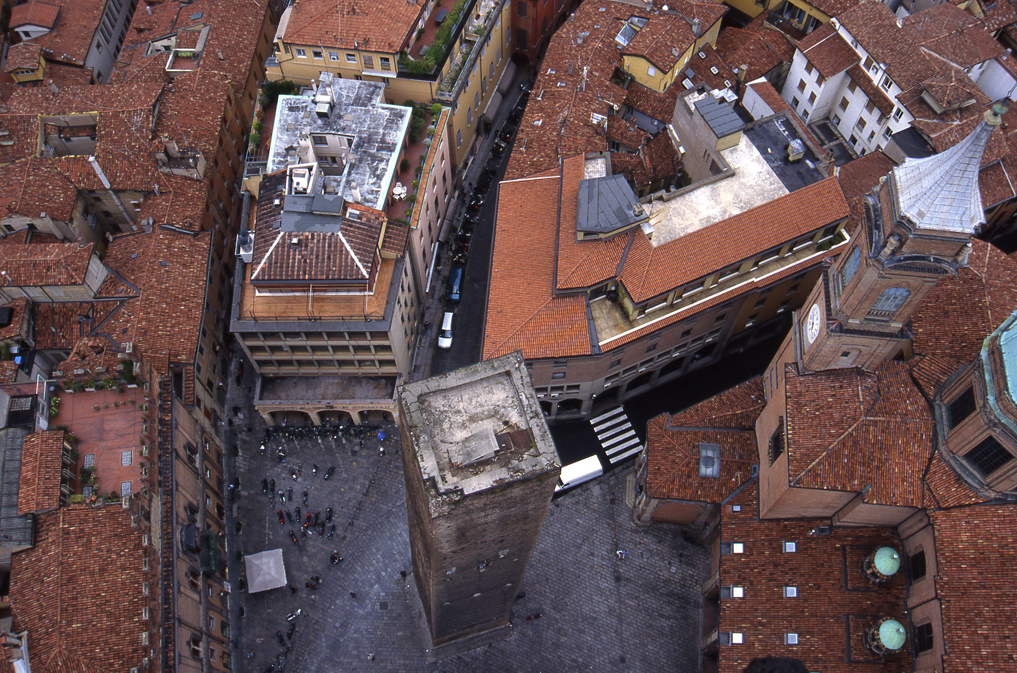 View of the Garisenda Tower from the Asinelli Tower in Bologna.