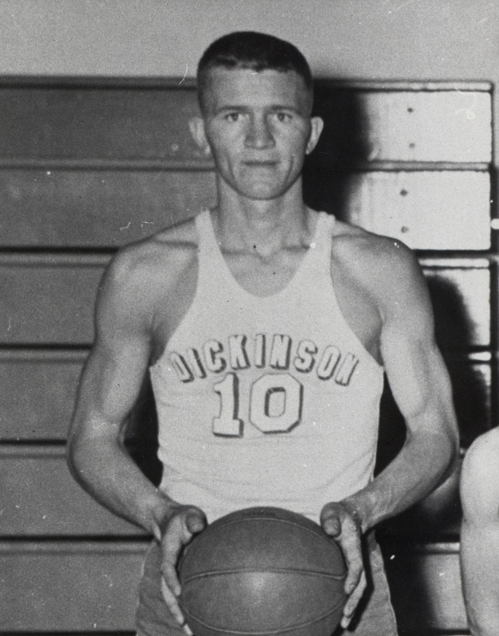 Vincent Joseph Schafmeister Jr. (Class of 1949) poses with a basketball.
