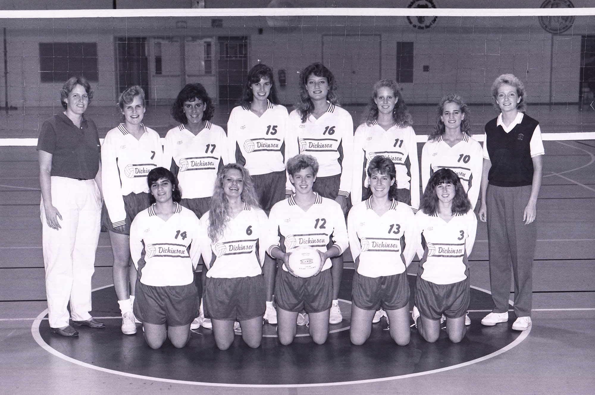 The Volleyball team poses for a group photograph in the Kline Center in 1989.