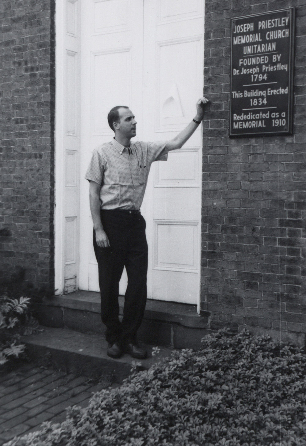 View as Walter Eggert Beach (Class of 1956) visits the Joseph Priestley Memorial Church in Northumberland, Pennsylvania around 1960.