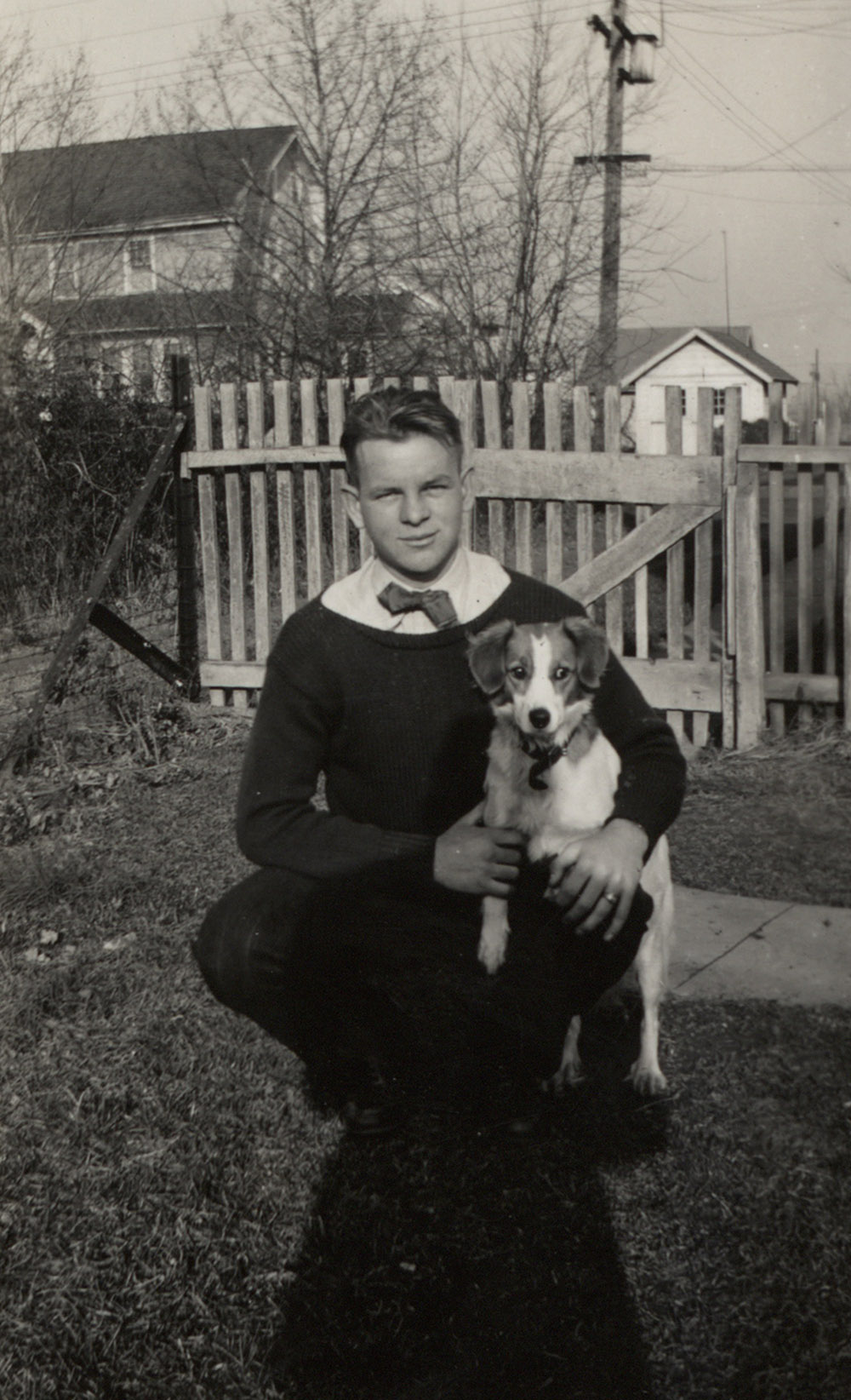 Wayne Tice Sheppard poses for a picture with a dog. Location Photograph Archives Format Photographic Print, B&W Decade 1940-1949 Roles Students People Sheppard, Wayne Tice