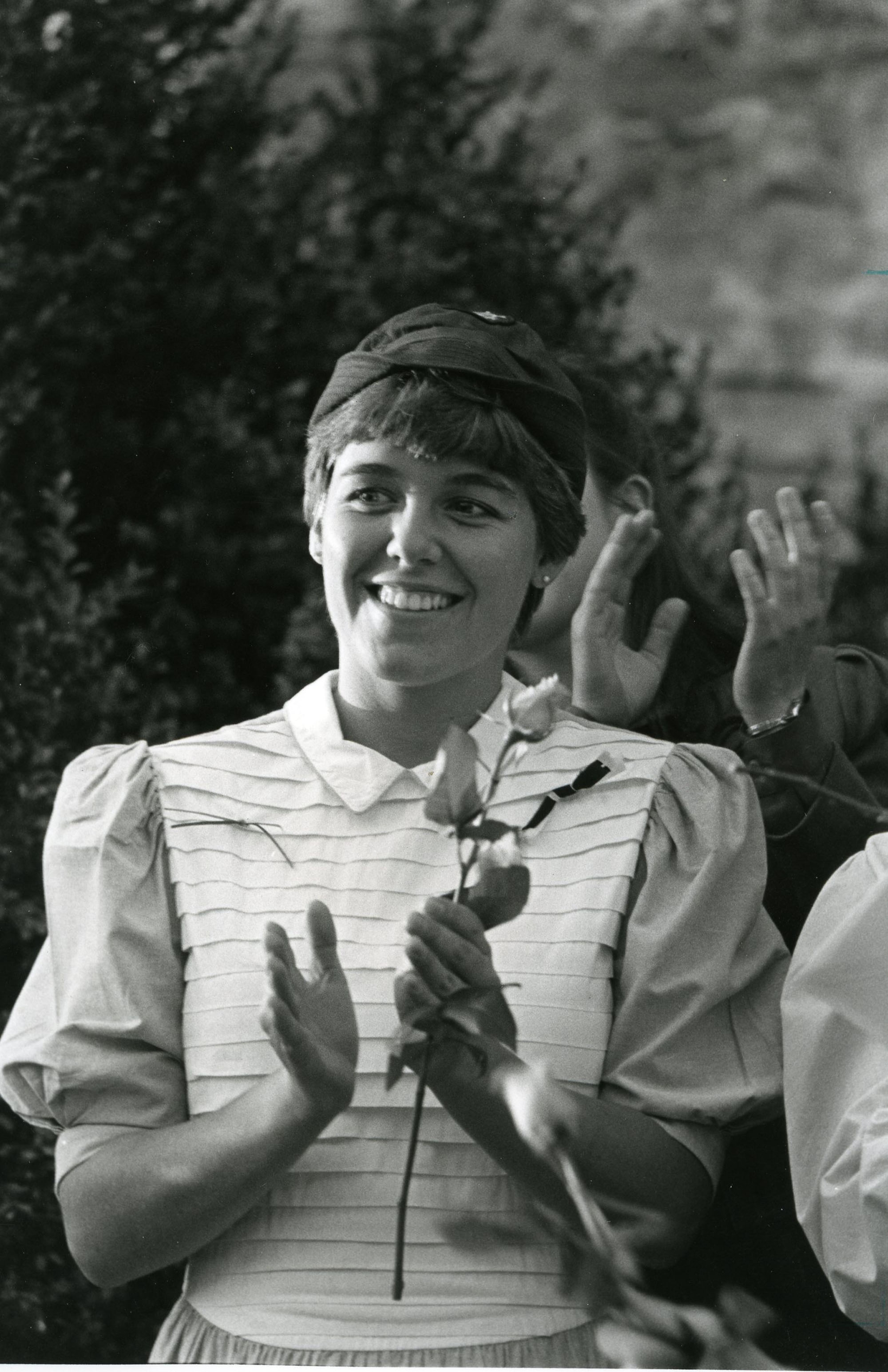 A member of Wheel and Chain at the annual tapping ceremony in front of Old West in 1984.