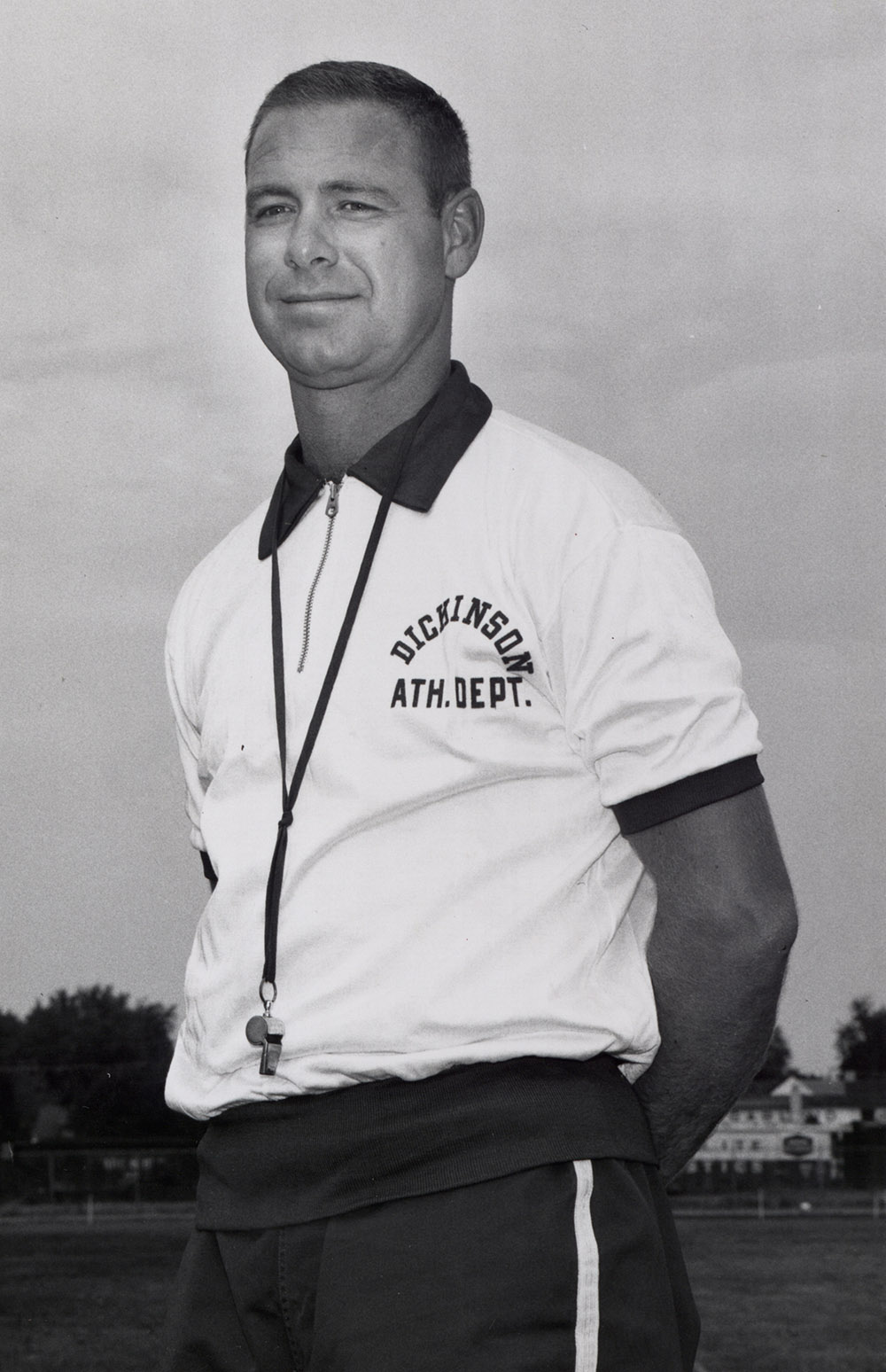 View of football coach Wilbur Jacob Gobrecht (Class of 1952) on September 15, 1964. Location Photograph Archives Format Photographic Print, B&W Decade 1960-1969 Roles Alumni Coaches People Gobrecht, Wilbur Jacob