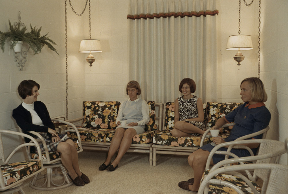 View as four students chat in Witwer Hall around 1965. Location Photograph Archives Format Photographic Print, B&W Decade 1960-1969 Places Witwer Hall Roles Students Other Residence Life