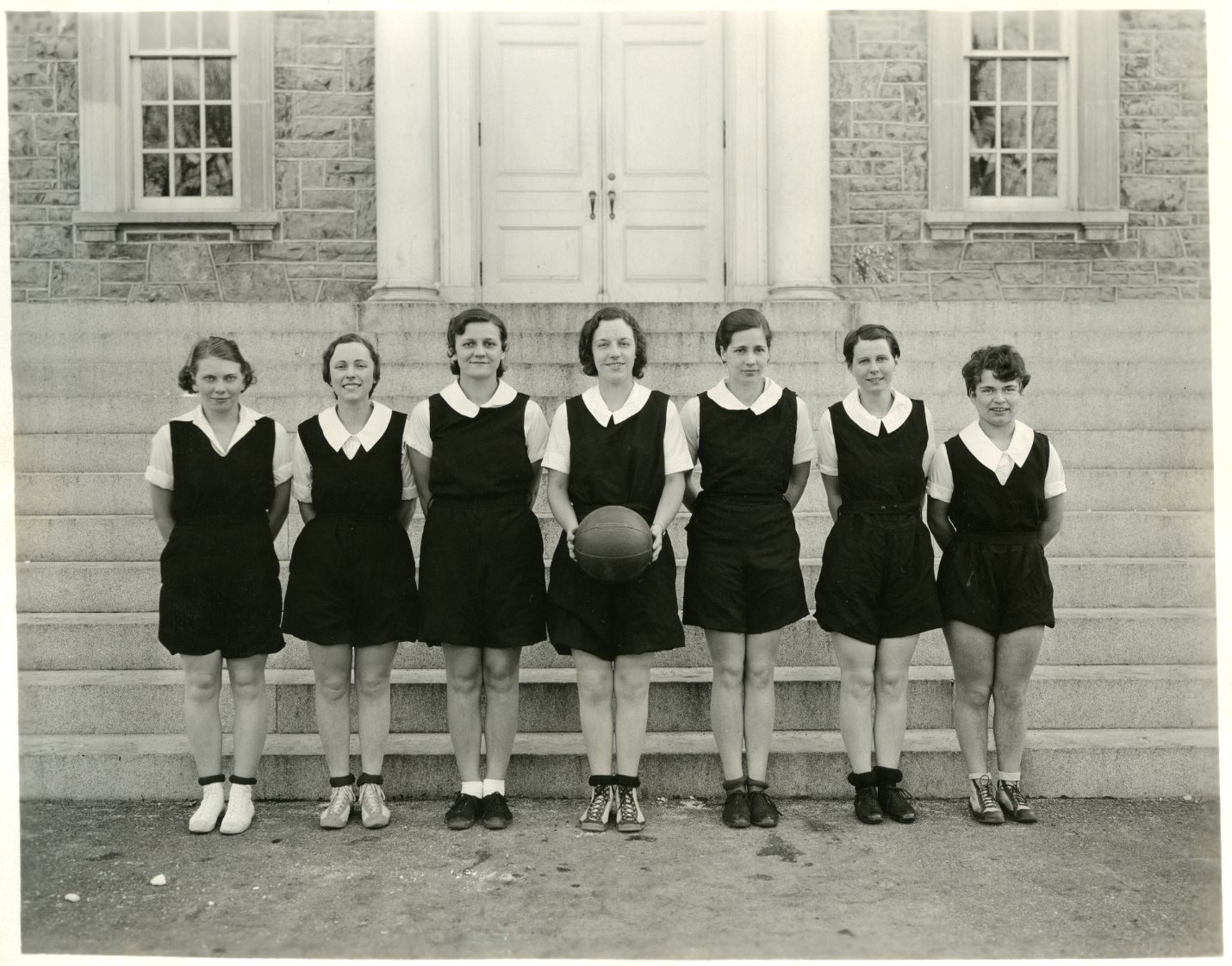 The Women's Basketball team poses outside of the Alumni Gymnasium during the 1931-1932 academic year.