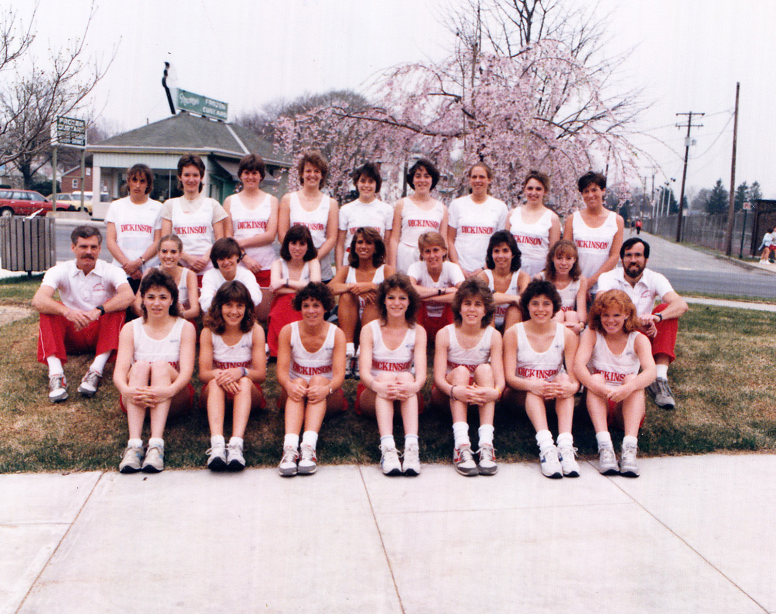 The Women's Track team sits with Coaches John Cantalupi and Larry Moser in front of Massey's in 1986.