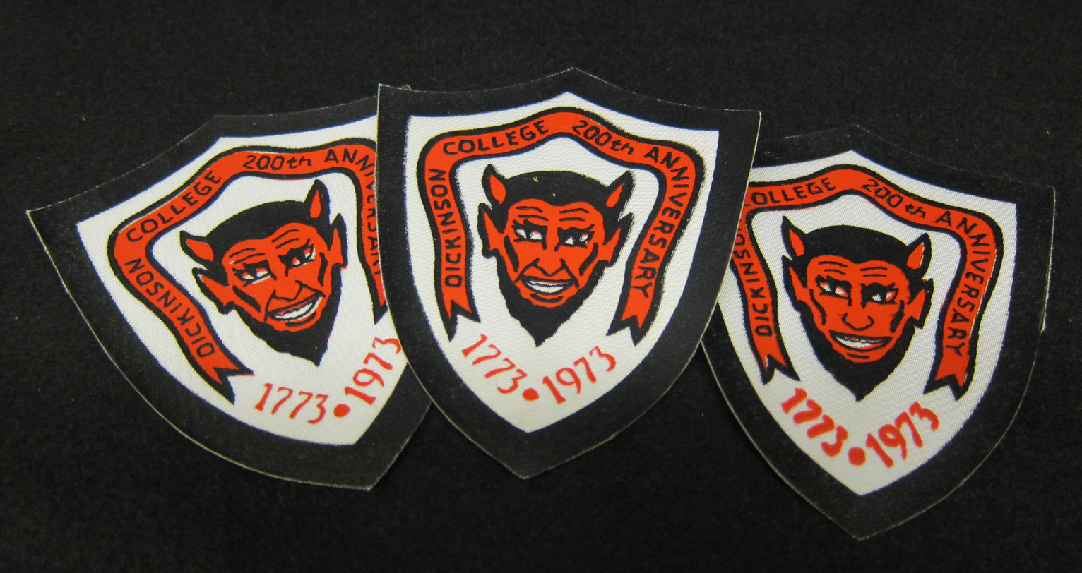 Three shield shaped black and white patches featuring the devil mascot and banner reading "Dickinson College 200th Anniversary."