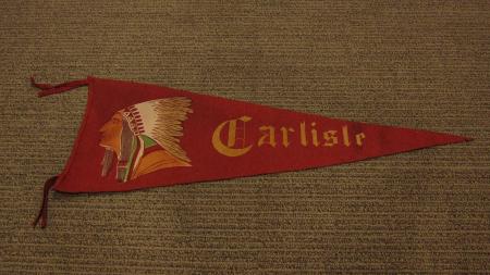 A red felt pennant with the image of a Native American in a headdress. The word "Carlisle" is written in gold next to the image.