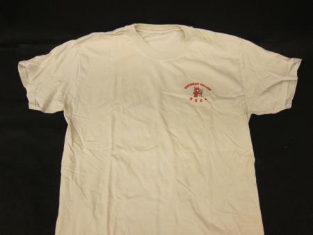 A tan T-Shirt, no tag, with a cartoon figure of the red devil with a pitchfork and text around it in red that reads "DICKINSON COLLEGE 2004" on the upper left corner of the chest. On the back "COME ON BABY LIGHT MY FIRE" written in a flame design with the devil cartoon as the "i" in "FIRE". Underneath is the text "DEVIL'S ADVOCATES" in red.