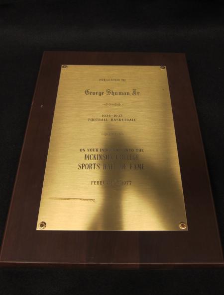 Wooden plaque (11.2” x 15”) honoring George Shuman Jr. (Class of 1937) upon his induction into the Dickinson Sports Hall of Fame in 1977. Shuman Jr. played football and basketball.