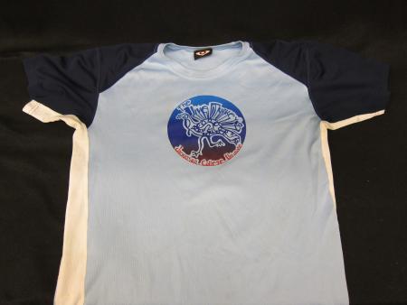 A light blue and dark blue jersey, size medium, with the Jive Turkeys team design, featuring a turkey and the text "The Jive Turkeys" in blue and "Jickinson College Ultimate" in red. On the back "George W. Bush 666" is printed in blue. This item belongs to Andrew Cassidy-Amstutz.