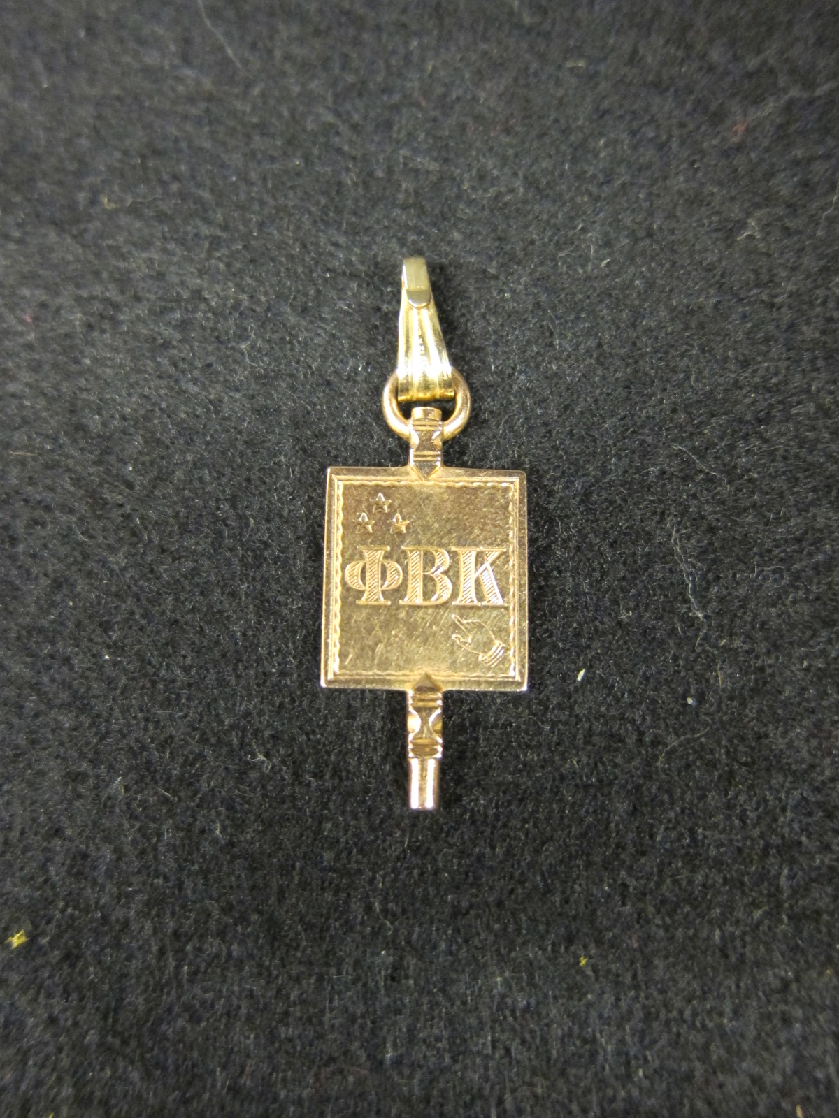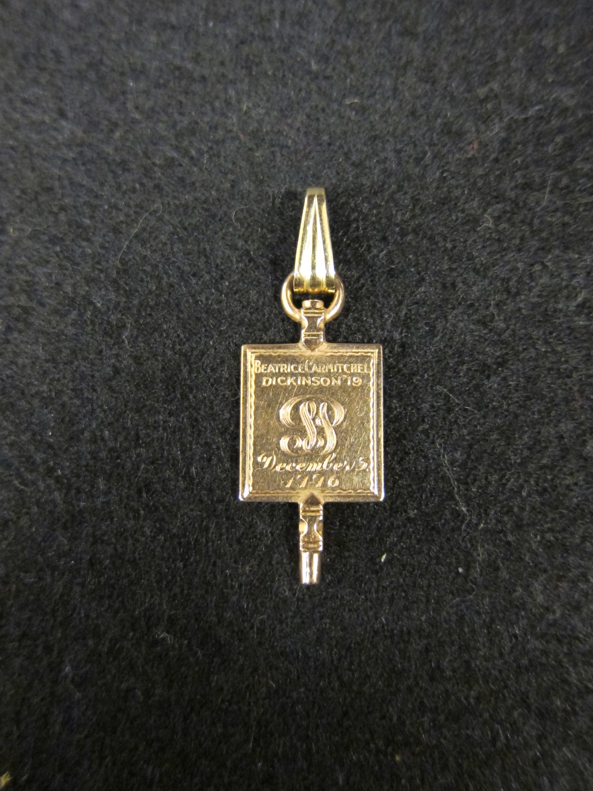 A small gold metal necklace charm of a Phi Beta Kappa key with “Beatrice Carmitchel, Dickinson ’19, December 5, 1776” engraved on the back. Given by donor’s mother (Beatrice Earle Carmitchell) to donor (her daughter) at her graduation from Dickinson in 1951.
