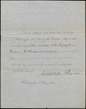 President Franklin Pierce authorizes Secretary of State William L. Marcy to "affix the Seal of the United States to the envelope of a letter addressed to Her Majesty Queen Victoria," which contains James Buchanan's credentials as the new Minister to the United Kingdom.