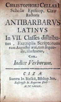 Cellarius, Christoph. Antibarbarvs Latinvs In VII. Classes distributus, Exemplis Scriptorum tum Augustei aeui, tum sequioris, illustratus. Zeitz: Sumtu Io. Bielkii. Exscripsit Io. Rupertus Keili, 1678.