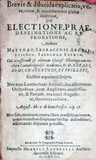 Hutton, Matthew. Brevis & dilucida explicatio, verae, certae, & consolationis plenae doctrinae, De Electione, Praedestinatione Ac Reprobatione. Harderwyck: Thomae Henrici, 1613.