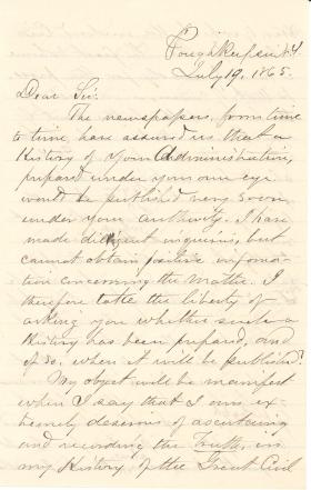Benson John Lossing writes Former President James Buchanan with questions about the publication status of "a History of your Administration, prepared under your own eye." Lossing is writing a history of the Civil War and would like his account to be fair to Buchanan's administration. "I am a simple searcher after truth, and wish to be a Chronicler only of truth," as Lossing explains. "While I loathe the selfish man who raised the arm of rebellion against their government," Lossing notes that "I have no party prejudices to serve or obey." Transcript included.