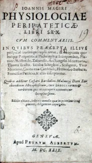 Magirus, Joannes. Physiologiae Peripateticae, Libri Sex. Cvm Commentariis..Quibus additur Caspari Bartholini.Enchiridium Metaphysicum. Geneva: Petrvm Albertvm, 1629.